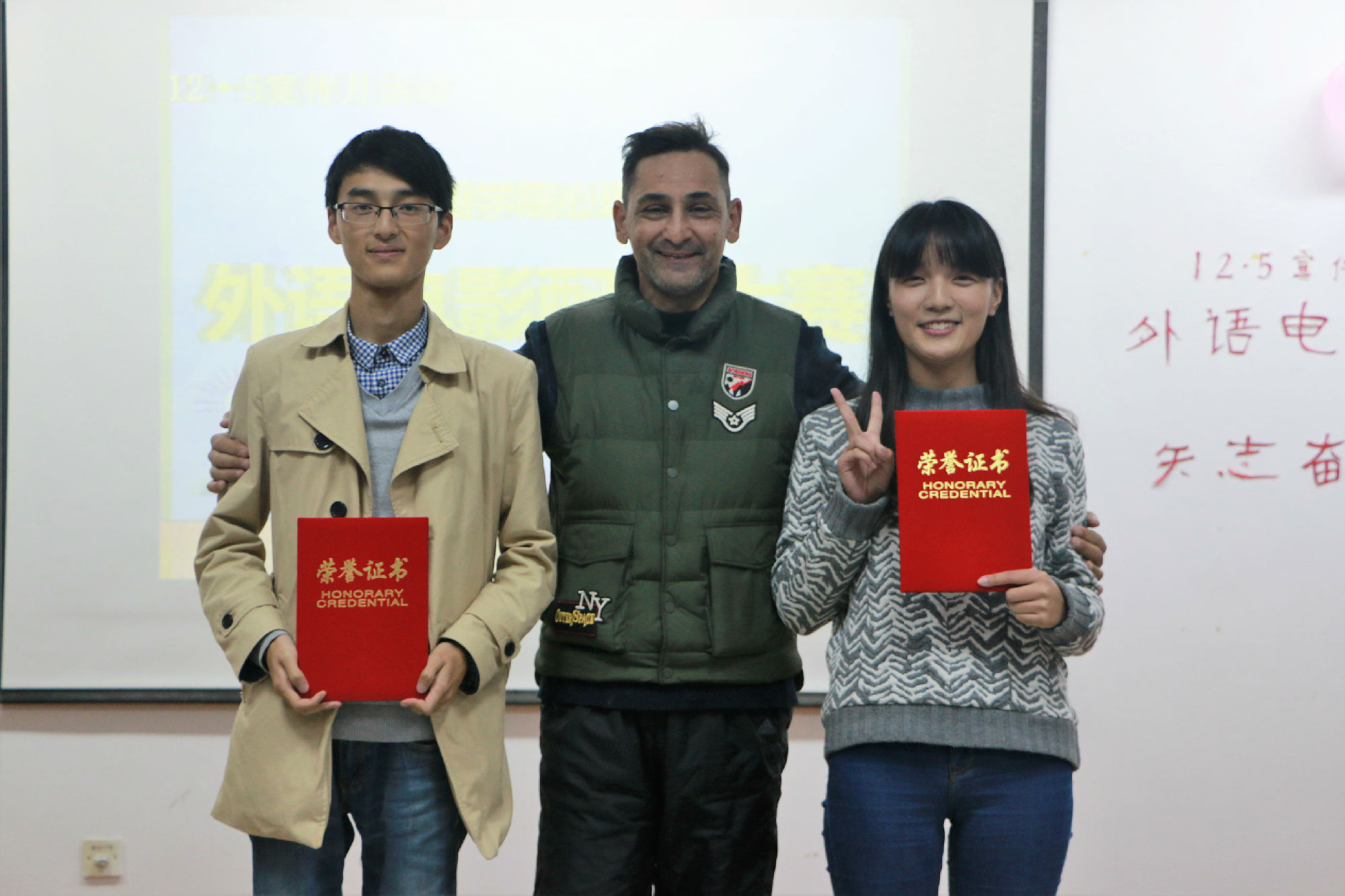 2016年11月20号下午两点半,云顶国际心理协会在计算机楼206成功举办了以“坚持、拼搏、筑梦”为主题的外语电影配音大赛。参与本次活动的嘉宾有公司党委副书记副经理陈俊怀老师、院学工办主任顾亚梅老师、院团委书记王媛媛老师、15级辅导员施旋老师以及校心协一对一负责人刘虎同学。同时,日语外教朝日勉老师、英语外教Michael老师、13级英语专业张玉莹、日语专业翟静担任评委。
