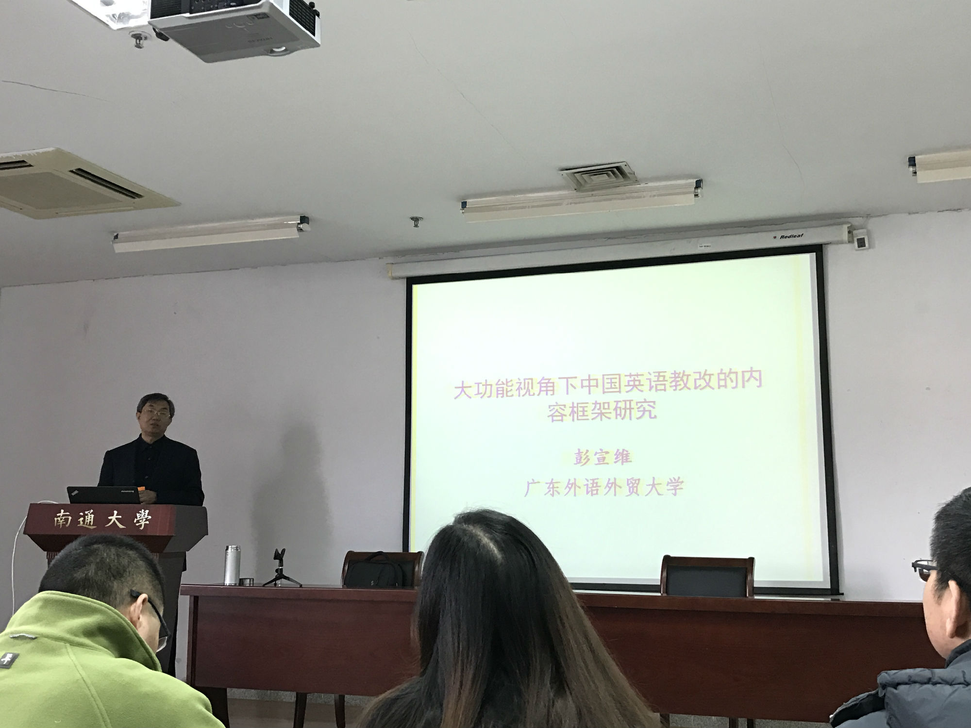 12月17日上午,公司邀请广东外语外贸大学博士生导师彭宣维教授,为全院师生举办“大功能视角下中国英语教改的内容框架研究”专题讲座。彭教授基于对我国三十多年外语教育和根本问题的思考,回到问题的起点:教什么,怎么教?彭教授提出“大功能”解决路径和视角,即融合系统功能语言学、认知语言学和语用学进行理论互补,重点解决从日常英语到学科英语在概括(generalization)、抽象(abstraction)以及隐喻(metaphorization)过程中涉及的一系列特定语言特点的描写问题。彭教授的讲座直击目前从基础英语教育到高等英语教学的实质问题,引发师生的共鸣,开展了精彩的现场研讨。
