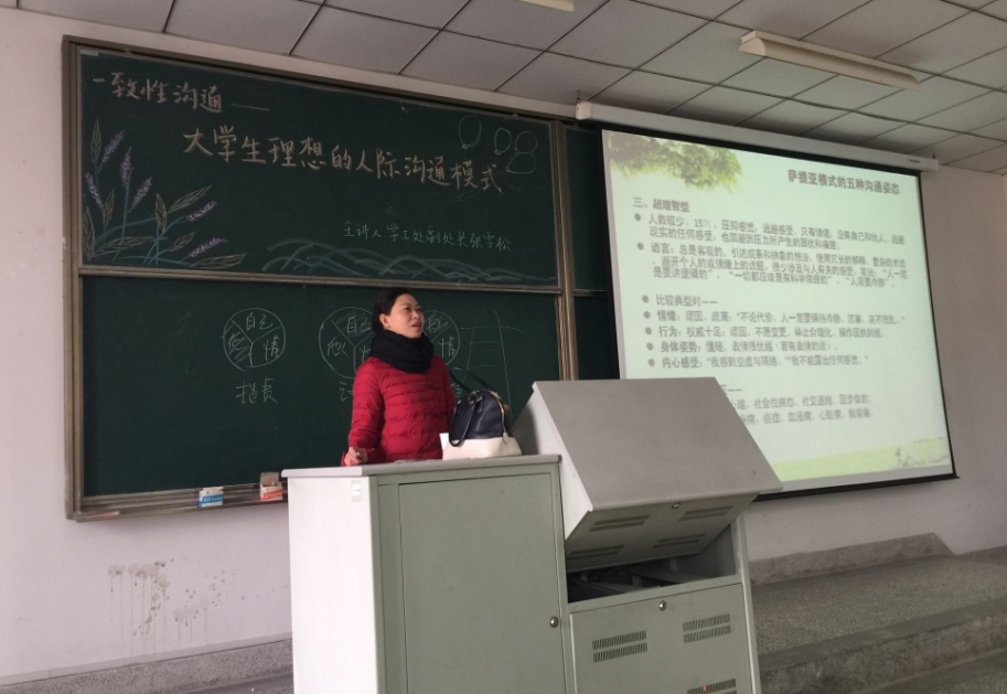 2016年12月23日下午2点,由公司心理协会主办的心理讲座之“一致性沟通--老员工理想的人际沟通模式”在8号楼106举行。由学工处副处长张雪松老师担任主讲,参与本次讲座的嘉宾有院学工办主任顾亚梅老师及15级辅导员施旋老师,公司15级全体员工参与聆听。