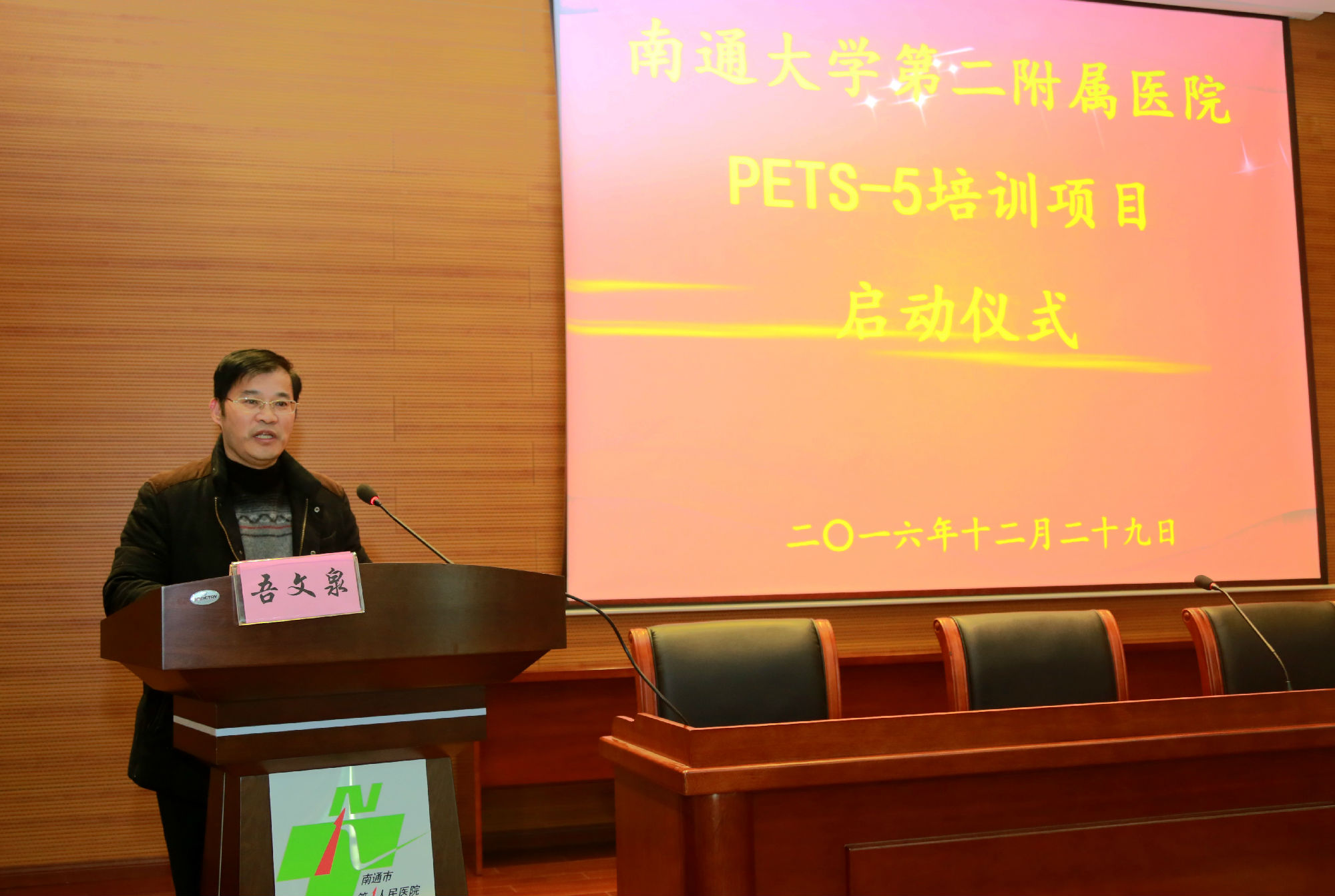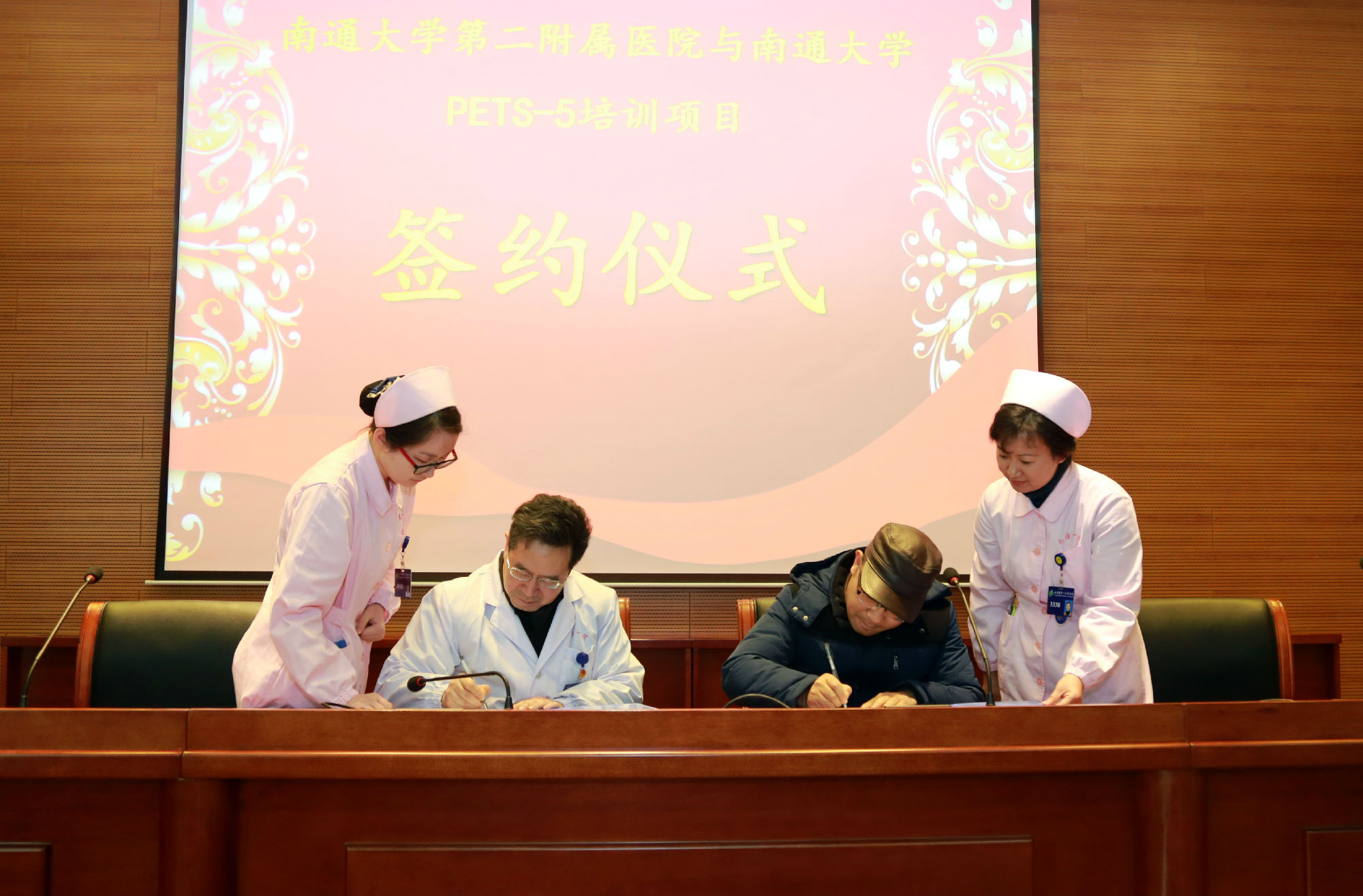2016年12月29日下午,云顶国际与云顶国际第二附属医院(南通市第一人民医院)就PETS-5培训项目举行了隆重的签约仪式。签约仪式在第二附属医院举行,医院陈建荣经理、云顶国际继续教育学院成云雷副经理、云顶国际吾文泉经理、陈俊怀副书记、任课教师,以及报名参加培训项目的50多位医护人员出席了签约仪式。陈建荣经理和吾文泉经理分别在签约仪式上致辞。