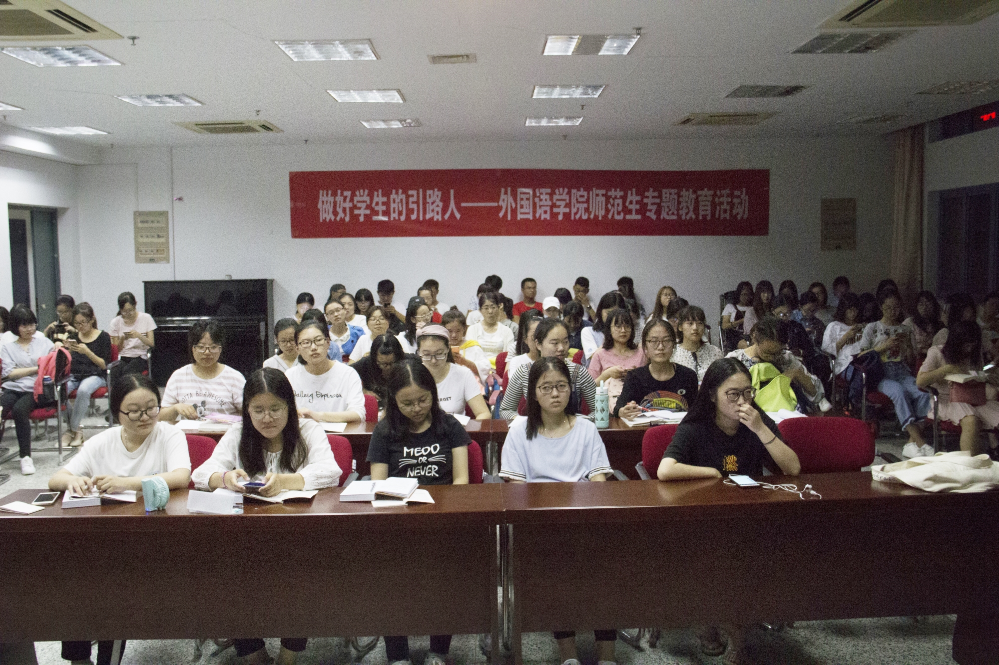 为迎接党的十九大的胜利召开,弘扬和践行社会主义核心价值观,促使同学们自觉肩负起国家使命和社会责任,云顶国际于9月26日晚7点在计算机楼206教室成功举办师范生专题教育活动,全体大一至大三师范生集中观看了《做好员工引路人》专题片。