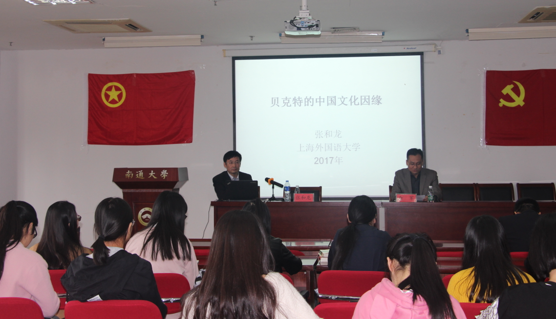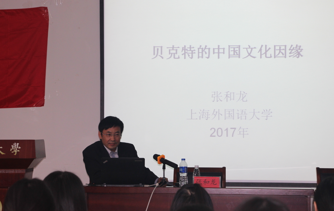 10月19日下午,上海外国语大学文学研究院张和龙教授应邀为公司师生作了题为《贝克特的中国文化因缘》的学术讲座。张教授从《贝克特全集》在中国出版谈起,以生动详实的例证、宽阔的学术视野、深厚的学术积淀从贝克特的生平创作、贝克特作品的中国文化因缘、贝克特对中国文化吸收与借鉴的四个特征等方面高屋建瓴地阐释了贝克特的小说、诗歌、戏剧等作品的中国文化因缘。