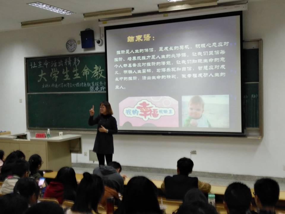 正式讲座前,张老师以充满活力的金龙拍手操,引导现场同学做了一个热身运动,活跃了现场氛围,提高了同学们的参与积极性。本次讲座内容共分为四大部分,分别为教育的现状与反思、探寻生命的意义、积极心态应对挫折、抗挫能力培养历练。讲座中,张老师不时通过生动的视频展示、翔实的案例列举等方式,引导同学们明白生命的意义在于“寻找真我,活出真我”,她强调,“挫折是不可避免的,积极的心态有助于我们克服困难,决定成败的关键在于应对挫折的能力”。这些充满正能量的话语令同学们受益匪浅。同学们认真倾听并多次与老师进行互动,现场气氛甚是热烈。讲座最后,张老师为现场同学寄语道:“树立一个目标并智慧应对成长中的挫折”。