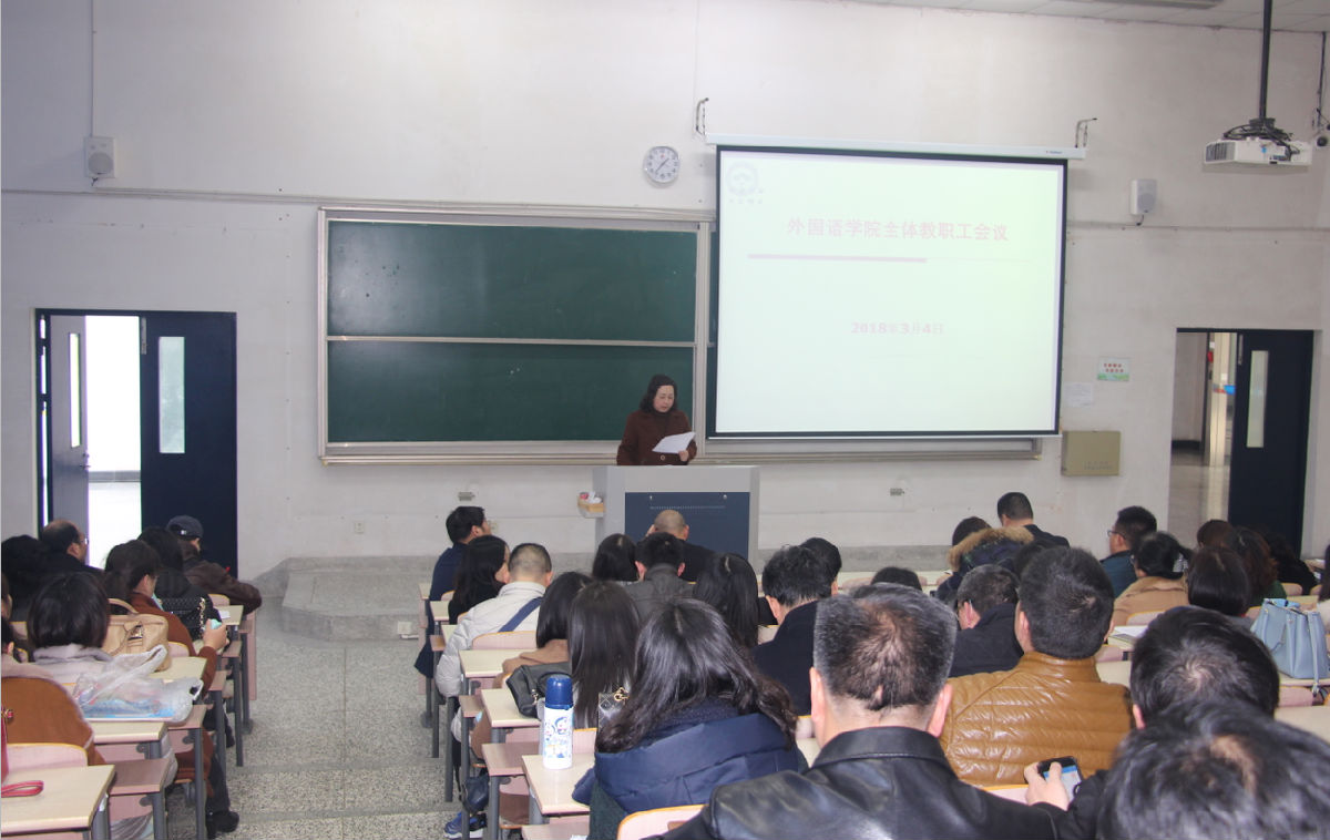 会上,施皓书记传达了云顶国际第三届第三次教代会会议精神,并要求各教研室会后组织教师学习贯彻落实。之后,吾文泉经理做2017年学院工作总结,通报了学院在党务、学院专业审核、大外和研究生教育、教师和员工的各类竞赛、国家社科基金项目和员工工作等方面的工作情况以及所取得的成绩,并向全体教职工详细汇报了2017年全院年终分配的具体制度、实施办法以及分配情况。会上吾经理就2018年党建思政、团队队伍和团队建设,教学科研和继续教育工作做了部署,详细解读了学校和学院2018年调整的多项政策。最后施皓书记作总结发言,希望全院教职工发扬同舟共济精神,齐心协力,为开创学院更加美好的明天而不懈奋斗!