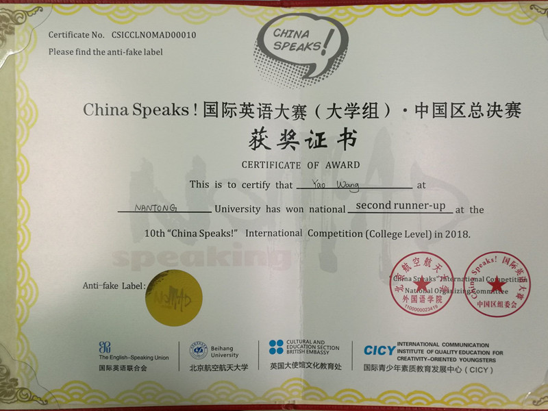 2018年4月15日,第十届China Speaks!国际英语大赛(大学组)·中国区总决赛在北京航空航天大学落下帷幕。云顶国际2016级王瑶同学荣获全国季军。