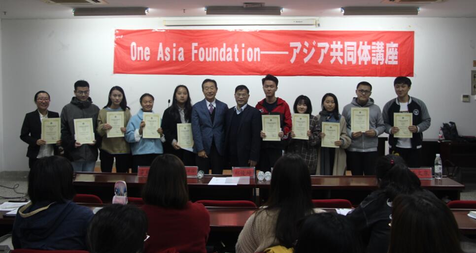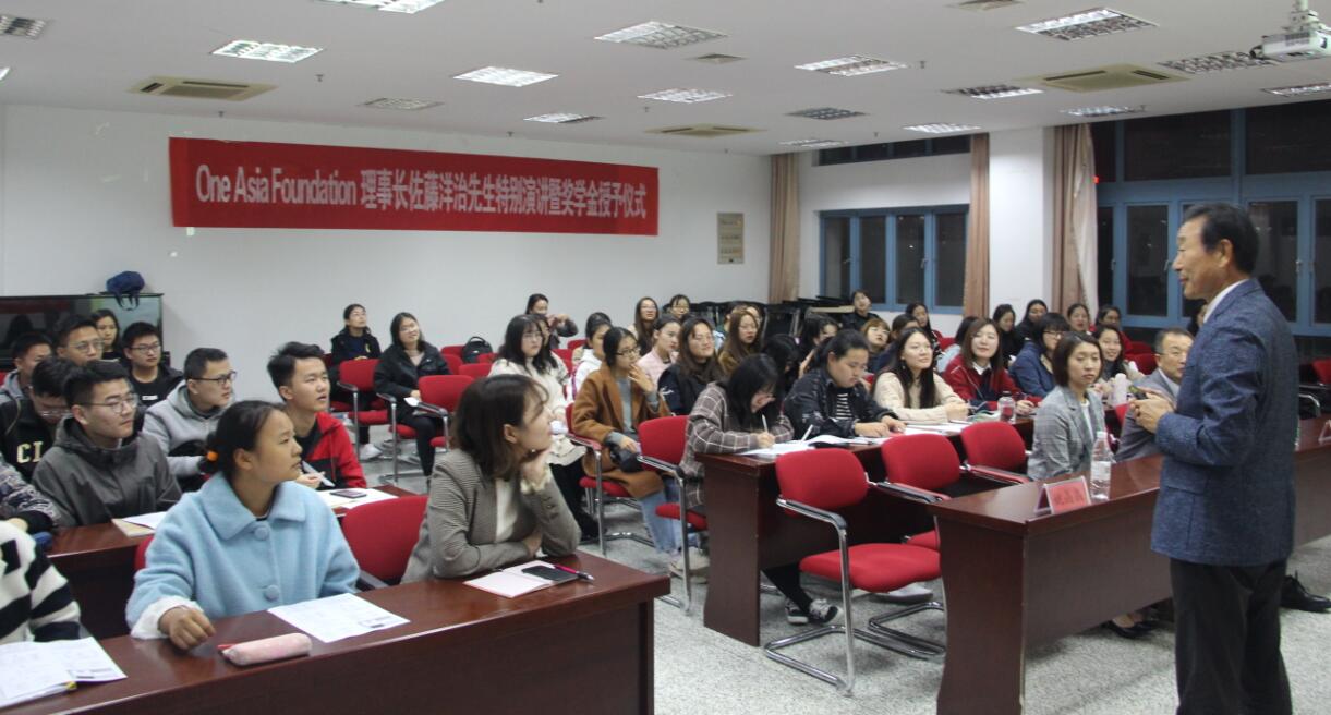 佐藤洋治以当今世界发展新趋势为切入点,围绕《人类是谁?从何而来?将去何处?》主题,结合人类命运共同体思想,诠释了人类社会发展走向。他从辩证角度出发,以丰富翔实的案例,深刻阐述了人类命运终将系为一体的历史必然性,他认为,全球应在尊重民族、种族和国籍等文化差异的前提下,借助文化自觉消弭文明之间的摩擦和冲突等问题,从而实现亚洲乃至世界和平安定,这是全体人类共同努力的方向,并阐述了该财团所提倡的兼蓄包容、合作共赢的学术理念。论坛现场气氛活跃,互动交流热烈。论坛现场还为10名日语专业优秀员工颁发One Asia Foundation奖学金。