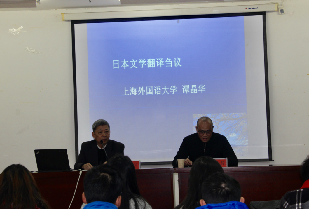 下午,谭晶华教授为学院师生作题为《日本文学翻译刍议》的学术报告。他围绕“中国日本文学研究起始”、“莫言与村上春树的文学翻译”、“四十年从事文学翻译的心得”以及“中国文化走向世界的文学翻译问题”四个方面,分析了从五四运动前至中国日本文学研究会成立后的近百年内日本文学翻译的发展史,强调文学翻译应译出文字中潜伏的原作者的喘息、心跳、体味、气味、节奏和音乐感,指出成为一名优秀的翻译者需要发挥“工匠精神”,需要持之以恒地辛勤付出,更需要担负有传播中国文学和文化的责任心。谭晶华教授还对现场师生提出的问题进行了详细解答,激发了广大师生对日本文学翻译的研究热情。