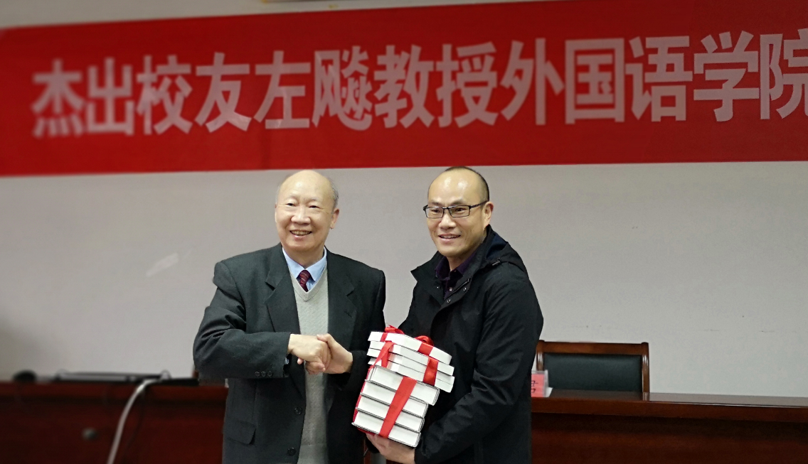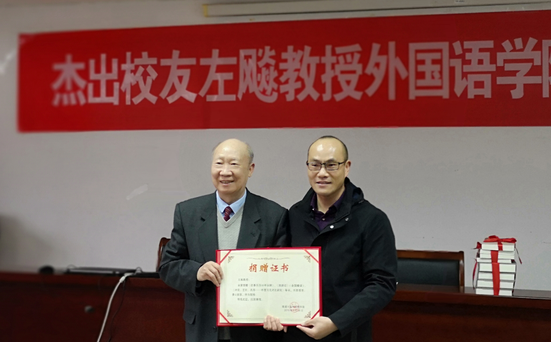 赠书仪式上,外国学院经理陆国君介绍了左飚教授的简况。左飚教授自1977年筹划和建立南通师专外文系以来,在专业研究上专注执着,百折不挠,做事上脚踏实地,持之以恒,做人上谦逊有礼,淡泊名利。赴任上海海事大学云顶国际经理以后,心里始终记不忘初心,心系母校。他高度评价了左飚教授关心学院文化建设和师生发展的善举,并向其颁发了捐赠证书。