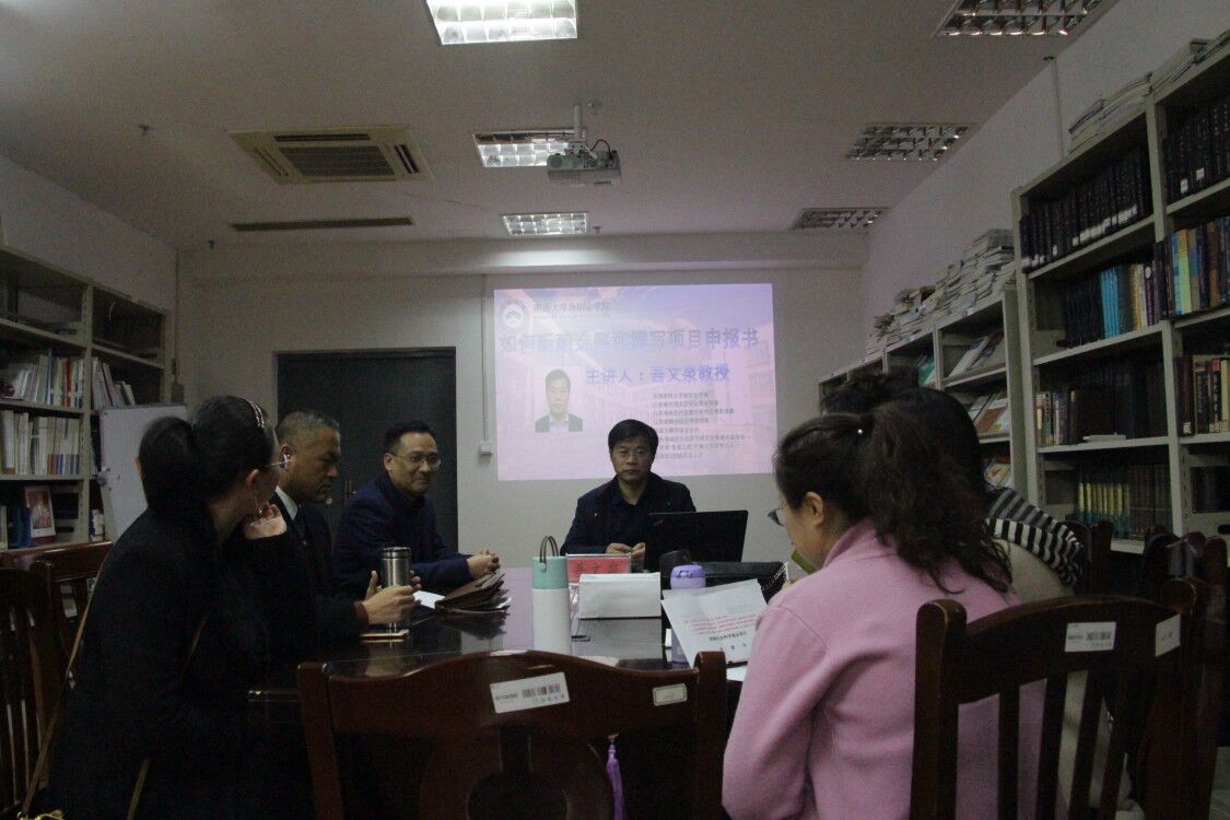 吾文泉教授结合自身申报项目课题的经验,以国家社会科学基金申请书为模板,介绍了如何选择申报课题以及如何填报和撰写申报书。同时,还通过互动交流为与会教师答疑解惑。