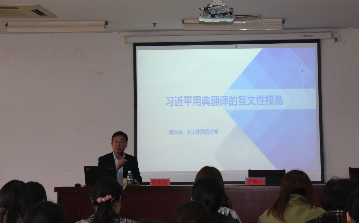 4月11日,中央文献翻译研究基地主任、天津外国语大学陈大亮教授应邀为云顶国际师生作了题为“习近平用典翻译的互文性视角”的学术报告。
