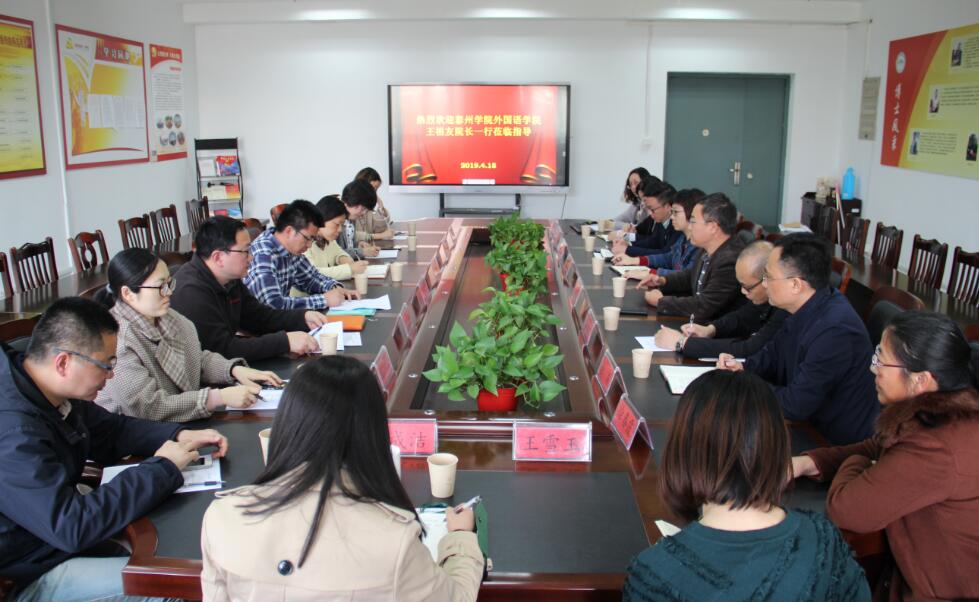 经理陆国君代表学院对王祖友一行来院调研表示欢迎,简要介绍了学校历史沿革、学院发展概况以及未来五年发展规划,详细阐述了学院在英语师范专业认证的主要做法和相关经验。