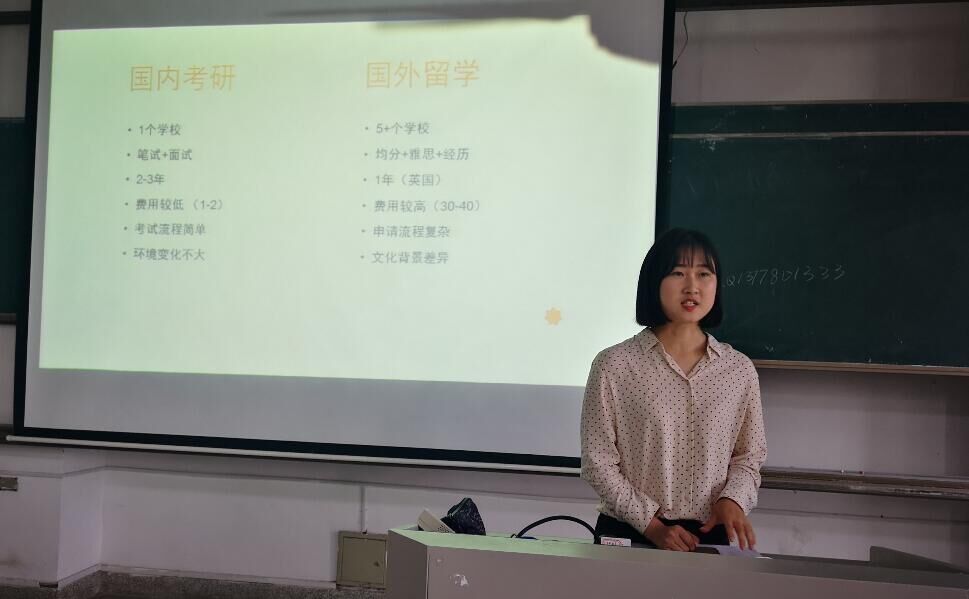 考取英国爱丁堡大学的英语师范151班周影同学讲述了自己选择留学的原因,并给大家直观地展示了国内考研与国外留学的区别,为有出国留学目标的同学们提供了很好的建议。被上海财经大学笔译专业录取的翻译152顾香同学与大家分享了自己在各门科目上的学习资料,然后提出了几个考研关键词:针对性复习、阶段/每日规划、及时总结、放平心态、珍惜时间、坚持就是胜利,为同学们的考研之路上了很好的一课。