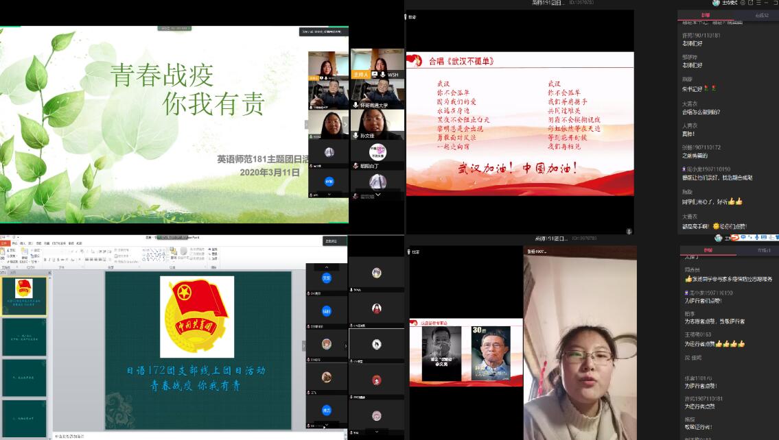 青年团员们积极响应、精心策划、有序组织,纷纷通过形式多样的“云”端活动,传递抗“疫”正能量。英语师范191团支部成员以一曲大合唱《武汉不孤单》,为武汉送去祝福,为抗疫凝聚力量;英语师范181团支部成员制作了花样居家小视频,分享交流了大家的假期生活与收获,一同探讨如何把居家生活过得更加有趣、充实;英语172团支部成员自发录制了《武汉加油》视频,表达了对打赢抗疫阻击战的决心和信心;商务英语191团支部成员讲述了战“疫”一线医护工作者的感人事迹,帮助大家更加深刻地认识了这群爱岗敬业、勇于担当的“最美逆行者”;商务英语182团支部的抗疫志愿者讲述了自己积极参加家乡疫情防控志愿服务的故事,用实际行动诠释了时代青年的责任担当;翻译172团支部成员一同朗诵了《致敬最美逆行者》,用声音传递力量,用真情讴歌一线抗击疫情的英雄;翻译192、日语171等团支部通过“青年大学习”,学习了国家对于疫情防控的相关对策与理念,并通过专题解答和大讨论,更好地树立了科学防疫理念;英语师范172、商务英语172等团支部通过信仰公开课云讲演的形式,呼吁青年应集热爱祖国、敬畏生命、懂得感恩、遵守规则、勇于担当于一身。