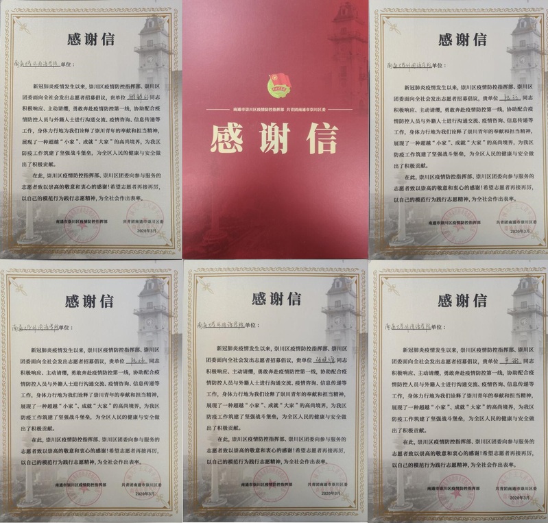 信中指出,新冠肺炎疫情发生以来,张晓源、陆炜、雒鲜红、严璐、陆珏、张品一等同学积极响应、主动请缨,勇敢奔赴疫情防控第一线,协助配合疫情防控人员与外籍人士进行沟通交流、疫情咨询、信息传递等工作,身体力行地诠释了崇川青年的奉献和担当精神,展现了一种超越“小家”、成就“大家”的高尚境界,为崇川区防疫工作筑建了坚强战斗堡垒,为全区人民的健康与安全做出了积极贡献。