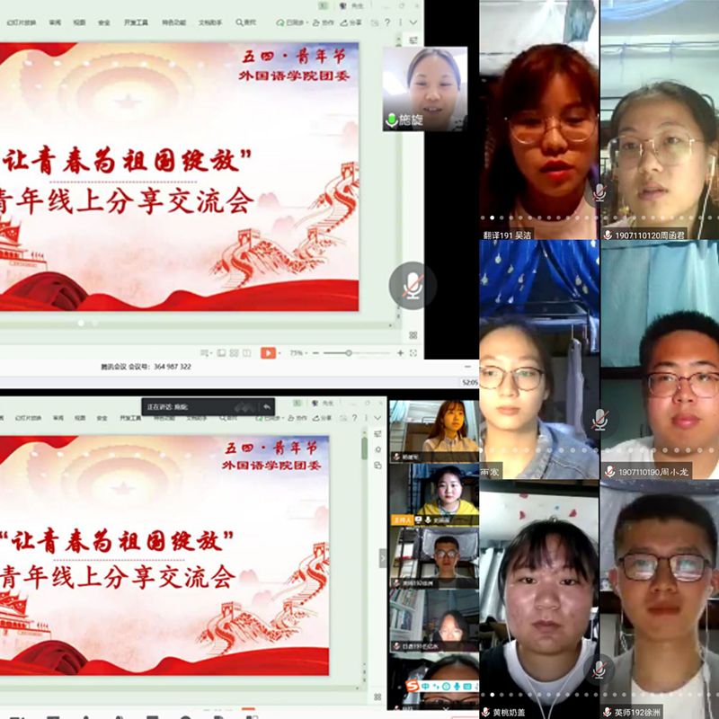 同时,学院举办了“致未来的自己”线上分享交流会,参与的对象主要为学院校级、院级“两红两优”获得者与学院团学新组织的团员青年们。第一环节中,杨援军、伍亿水、赵时笑、孙海燕四位同学作为代表和大家分享了他们在观看“让青春为祖国绽放”网上主题团课后的所想所思。第二环节中,优秀学姐学长代表——目前在广西师范大学读研的商务英语151班陈晓丽、苏州大学读研的日语151班刘圣杰以及英国思克劳德大学读研的商务英语162班陈迪同学,分别讲述了自身的留学、考研经历,分享了他们的青年梦。第三环节中,团员青年畅谈未来。吴颖对二十岁的自己说:“青春的脚印蜒在桃李之年的土地上,斑斓的梦翱于湛蓝的天空中,二十岁的自己,年轻、快乐、精彩。”谈及“而立之年”,徐洲说:“希望十年后,才华够得着梦想,实力护得了所爱。”王征同学希望三十岁的自己能永远坚持心中所想,有坚持到底的勇气。对于“不惑之年”,陈思怡说:“期望四十岁的自己,初心仍存,温和豁达。”石梓怡在写给50岁的自己的信里说道:“即便花季已逝,但花开是景,花落成诗,期盼自己依然笑看云卷云舒、花开花落。”吴淑华提到,年华积累的成果源于青葱时光的拼搏,初春的付出总会在人生之秋收获。第四环节中,陈青、钱佳慧、周荣、陆欣妍、陶寒、吴文頔等同学交流分享了参与此次活动的感想。大家纷纷表示,作为当代老员工,应当刻苦学习、不畏困难,争做树理想、爱祖国、担责任、勇奋斗、练本领、修品德的好样青年。活动的最后,公司团委施旋老师做了总结发言,她表示总书记的五四寄语是一份珍贵的青年节礼物,全院的团员青年们都要认真学习领悟,好好珍惜校园学习时光,以青春之我、奋斗之我践行五四精神,让青春之光闪耀在为梦想奋斗的道路上。