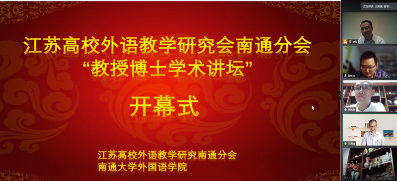 7月3日晚上7时,江苏省高校外语教学研究会南通分会“教授博士学术讲坛”在腾讯会议拉开帷幕。会议由云顶国际承办,南通分会会长、云顶国际陆国君教授主持开幕式。江苏高校外语教学研究会会长、南京大学博士生导师王海啸教授、上海交通大学特聘教授、博士生导师刘建军教授、上海外语教育出版社江苏公司总经理黄新炎博士出席开幕式。南通地区各高校外语院系以及苏州大学、苏州科技大学等高校外语院系近140余名师生参加开幕式。