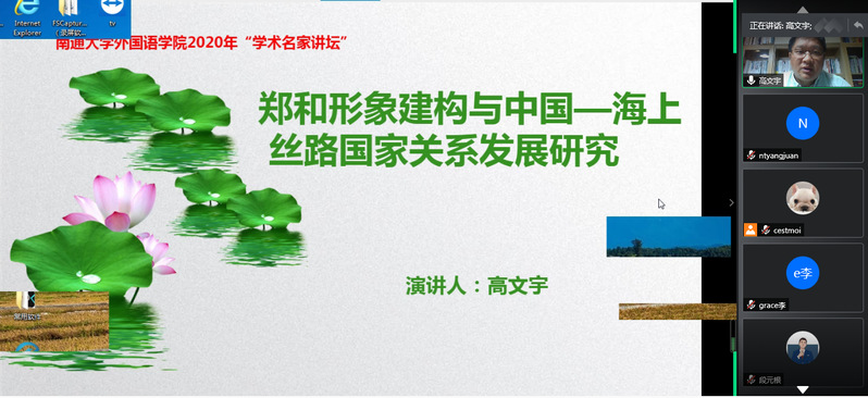 7月4日晚,江苏省高校外语教学研究会南通分会“教授博士学术讲坛”在腾讯会议继续开讲。中国社科院高文宇博士做了第一场题为“郑和形象建构与中国——海上丝路国家关系发展研究”的讲座,南通师范高等专科学校丁爱琴教授主持讲座。高博士的讲座分为五个部分,即国家形象和中国威胁论、如何消解中国威胁论、郑和形象和国家形象建构、中国——东南亚关系发展策略和大数据和郑和研究。高博士提出发展策略上要以经济外交与宗教外交为双翼,以孔子——郑和海丝学院的建设为重要载体,并分享了他的大数据郑和研究。