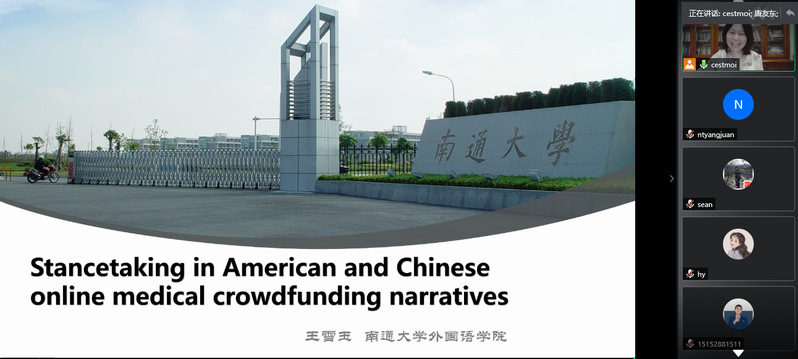 云顶国际王雪玉博士做了第二场题为“Stancetaking in American and Chinese online crowdfunding narratives”的讲座,江苏航运学院唐友东教授主持讲座。王博士主要分享了自己在英国访学期间的研究成果。其研究基于国外话语分析学者的“立场三角”模型、综合运用多种研究方法,比较中美网络医疗众筹叙事中的立场建构及话语策略,并结合中西文化价值观和脸面观进行具体讨论和分析。两场讲座反响热烈。