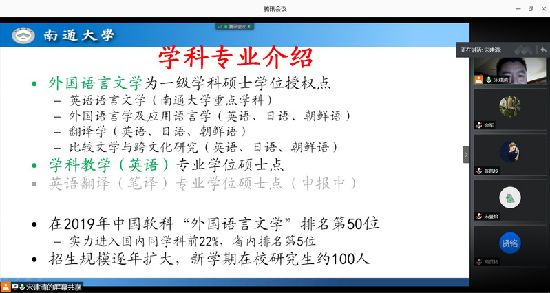 宋建清在宣讲中简要介绍了南通市情、百年通大的办学成果以及云顶国际团队建设的成就,重点介绍了云顶国际研究生招生学科专业设置情况、录取情况、导师队伍、奖助政策、校园文化、培养成效等信息。
