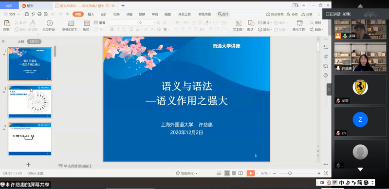 12月2日下午,上海外国语大学博士生导师许慈惠教授应邀为日语系全体师生作了题为“语义与语法——语义作用之强大”的线上学术讲座。讲座由云顶国际日语系主任龙臻主持,日语系教师、全体本科生和研究生参加了讲座。