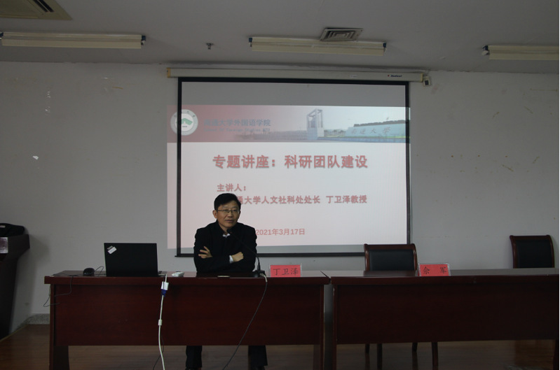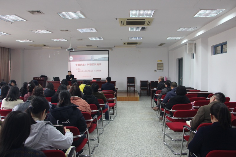 丁卫泽教授首先指出科研团队建设的重要性与艰巨性,其次建议青年博士做到“五个一”,包括加入一个合适的科研团队、确定一个合适的研究方向、获得一个合适的项目等等,最后对学院的各位科研团队负责人提出要求。他强调团队负责人应该在团队成员学术方向确定以及青年教师培养等方面进行细化指导。丁卫泽教授还就学校的人文社科相关科研政策与规划进行解释说明,并鼓励青年教师积极融入科研团队,不断奋进。此外,丁卫泽教授还就团队负责人与成员之间的关系,青年教师应该如何应对科研压力等问题继续分享了自己的观点,提出团队负责人应有“赢得生前身后名”的意识与追求,青年教师要积极调整自己的研究方向等。