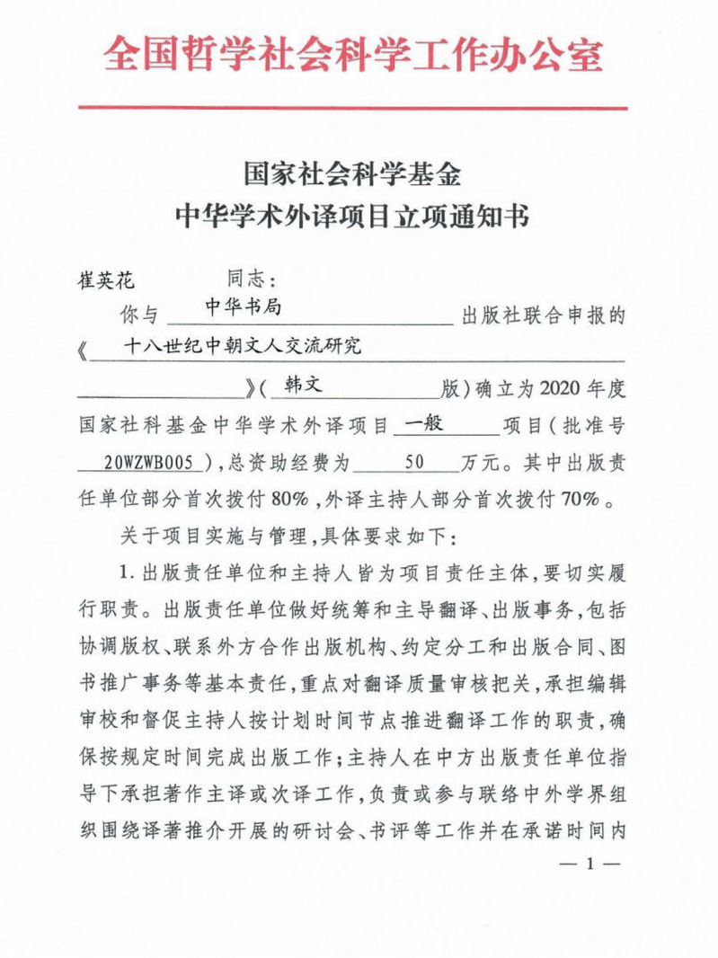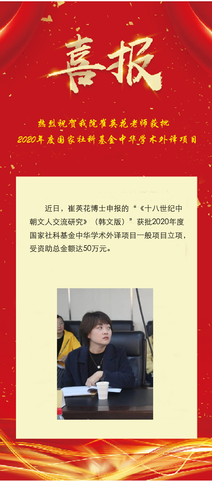 近日,云顶国际教师崔英花博士申报的“《十八世纪中朝文人交流研究》(韩文版)”获批2020年度国家社科基金中华学术外译项目一般项目(批准号:20WZWB005)立项,受资助总金额达50万元。崔英花博士的项目立项是公司第二次获批国家社科基金中华学术外译项目立项,也是云顶国际在国家社科基金该类别项目的新突破。云顶国际近年来组织化推进高水平项目申报工作,成效显著。