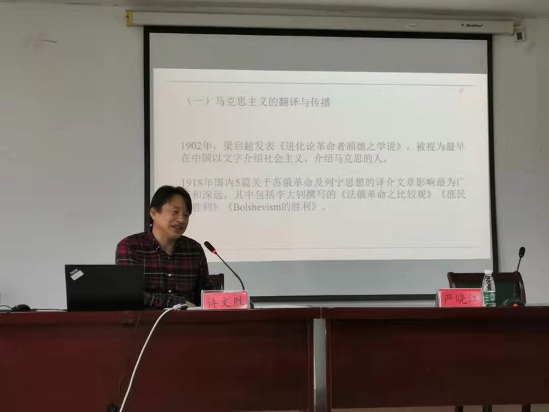许文胜教授以独特的视角梳理了中国共产党成立之前、之时以及建党之后翻译工作所发挥的巨大作用。许教授把中国共产党的历史和翻译活动结合起来,让听众既学习了党史,同时又了解翻译工作在我党百年发展史中所发挥的巨大作用。讲座中,许教授以其渊博的知识和风趣幽默的语言,赢得了听众的阵阵掌声。