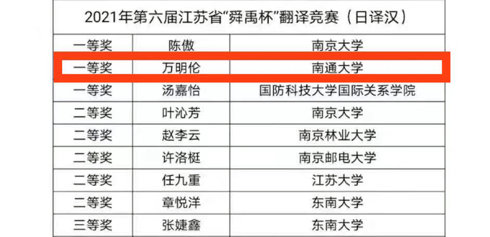近日,2021年第六届江苏省“舜禹杯”日语翻译竞赛落下帷幕。经过翻译界专家及评委的匿名评审,综合初赛和复赛成绩,评选出日译汉、汉译日的各级奖项及优秀组织奖。公司日语182班万明伦同学获得“日译汉”组一等奖,日语182班金莹同学获得“汉译日”组三等奖。公司被授予优秀组织奖。