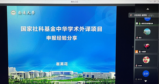 崔英花首先介绍了该项目的主旨、申报的基本流程与重要时间节点等,指出了本年度征集选题在遴选范围等方面的新变化。崔英花随后以自己的申报经历为例,详细地介绍申报工作的具体步骤,以及申报书内容应当如何填写,尤其是分享了申报书的具体内容,并总结了相关经验。最后,她以样章翻译为例,介绍了自己在翻译实践中的心得体会。