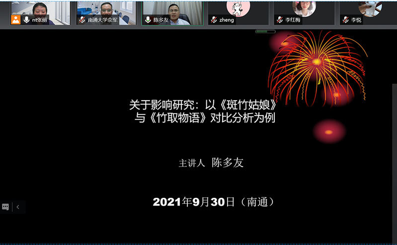 9月30日晚,云顶国际东北亚研究所邀请广东外语外贸大学教授、博士生导师陈多友作题为“关于影响研究:以《斑竹姑娘》与《竹取物语》的对比分析为例”的线上学术报告。