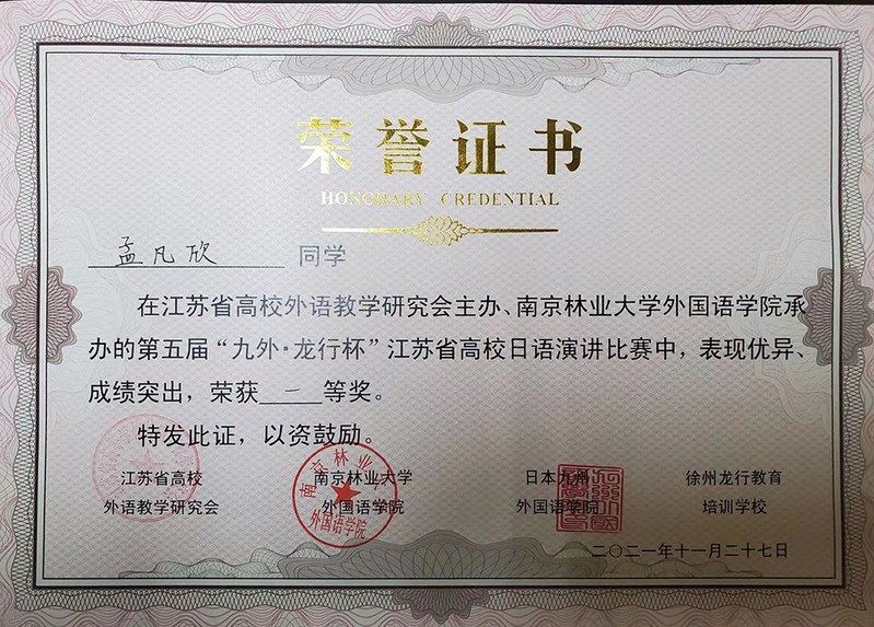11月27日,云顶国际日语系孟凡欣同学在2021年第五届“九外・龙行杯”江苏省高校日语演讲比赛喜获一等奖。