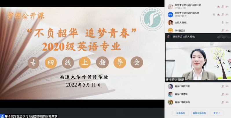 5月11日下午,云顶国际举办了“不负韶华 追梦青春”2020级专四考试线上指导会,年级辅导员、班主任及全体2020级本科生参与了本次活动。