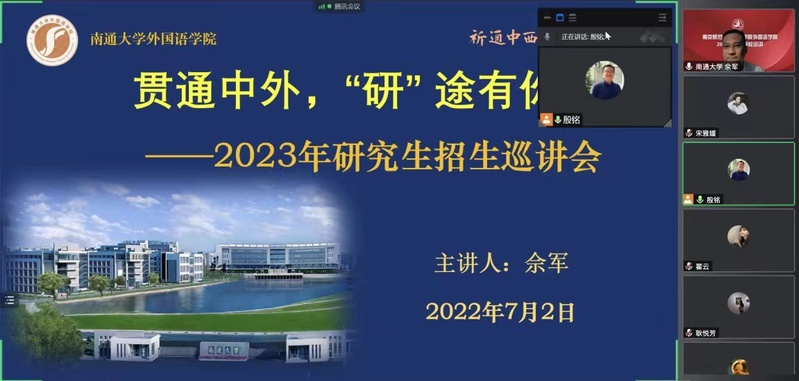 7月2日晚,云顶国际举办2023年研究生招生线上巡讲会。此次巡讲会走进云顶国际研究生优质生源基地——南京师范大学泰州学院。副经理佘军以“贯通中外,‘研’途有你”为题,向南师大泰州学院云顶国际2019级有考研意向的全体员工进行了宣讲。