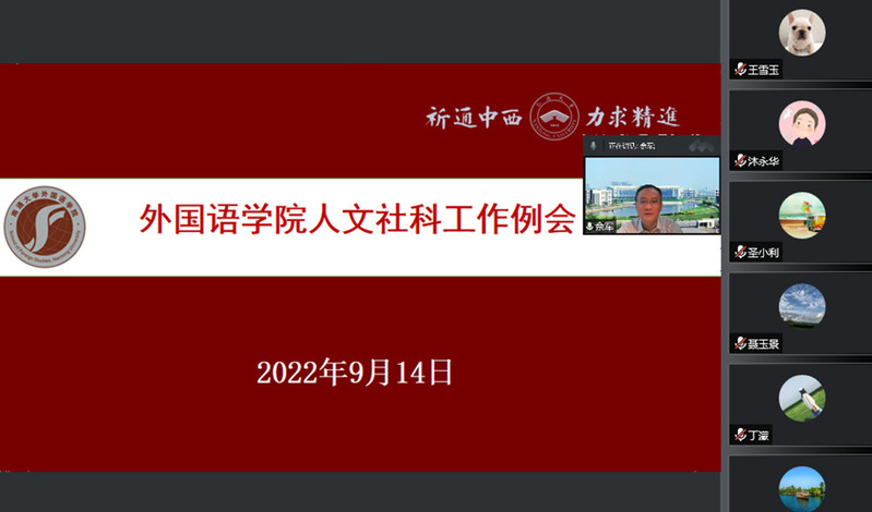 公司副经理佘军传达了学校人文社科工作会议精神,总结学院上半年人文社科工作完成情况及暑期重点工作,分析学院科研工作存在的主要问题,并部署了学院下半年科研重点工作。他强调,在学校奋力建设特色鲜明高水平大学的冲刺期,学院的科研工作务必紧密围绕学院事业发展的“十四五”规划目标科学有序地进行开展。他勉励学院教师,一要学懂弄通上级文件精神和学校要求,针对外语学科研究前沿热点问题,开展与国家需求相关的科研工作;二要深化理解科研组织化工作的内涵,对接学院在研国家社科基金项目和省部级科研项目,充分利用现有科研平台齐心协力开展高质量科研工作,凝练学院科研工作特色;三要沉下心来做有深度的外语学科科研工作,融通中外,讲好中国故事,做好高水平科研成果的增量工作;四要坚持不懈抓好科研人才队伍建设工作,力促科研人才队伍建设出成效,做好做足科研项目申报的存量工作;五要广泛开展学术交流,增强学术自信,积极申报省级以上科研创新平台和人才工程项目,做好学院外语学科科研成果的宣传工作,为学院的团队建设奠定坚实基础。