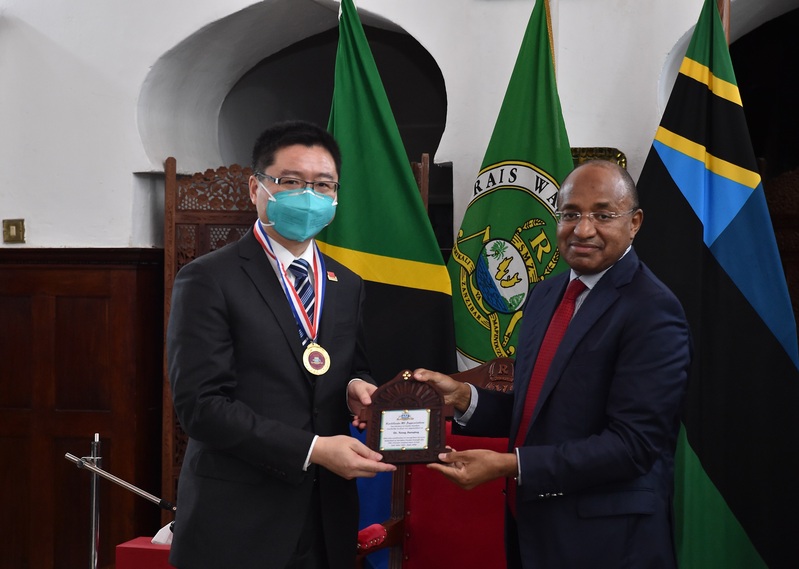 2022年9月10日恰逢中国的中秋节,坦桑尼亚桑给巴尔总统姆维尼接见了第31期中国援桑给巴尔医疗队,并代表卫生部向宋建清颁授奖章和证书,以表彰他为促进桑给巴尔卫生事业和中桑友谊所作出的贡献。桑卫生部马兹伊部长特意亲笔签署了感谢信,感谢公司派出优秀翻译,为桑给巴尔的卫生和公共事业发展提供了有力支持。