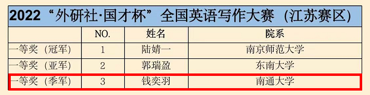 10月29日,2022年“外研社·国才杯”全国英语写作大赛江苏赛区决赛落下帷幕,公司陈凤华指导的医学院(护理学院)临床209班钱奕羽同学斩获季军,创下公司该系列竞赛历史最好成绩,在同层次高校中位居前列,将作为江苏赛区代表之一参加全国总决赛。