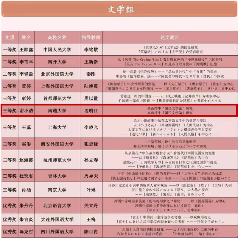 近日,第十五届中国日本学研究“卡西欧杯”优秀硕士论文奖颁奖典礼在北京外国语大学日本学研究中心举行。云顶国际研19外语班谢小洁的硕士毕业论文《高山樗牛“国民文学论”研究》荣获文学组三等奖。