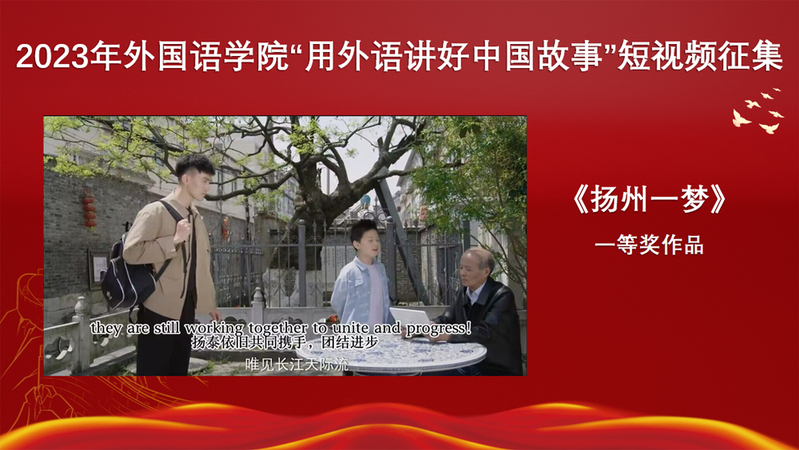来自英语师范、商务英语、翻译、日语四个专业的员工积极参与活动。大家围绕“大美中国·故乡风韵”主题,运用多元叙事技巧和丰富视听语言,用短视频多维度展现可信、可爱、可敬的中国形象。活动共征得26件作品,经评选,商务英语222班张天佑等三位同学创作的《扬州一梦》获一等奖;英语师范212班严翊菲的作品《南京云锦》和翻译192班王彦雯等四位同学的作品《心安之处》获二等奖;商务英语(合)201班吴佰纯等三位同学的作品《如皋水绘园》、翻译211班郁佳蕾的作品《舌尖美食(马蹄酥)》、英语师范(定向)221班徐石的作品《山水寄情,挚爱家乡》及英语师范223班曹格睿的作品《心中有国,家中有爱》获三等奖。这些优秀作品将通过学院微信公众号进行展示,进一步帮助师生深入学习贯彻党的二十大精神以及习近平总书记给南京大学留学归国青年学者回信中提出的“在坚定文化自信、讲好中国故事上争做表率”的重要指示精神。
