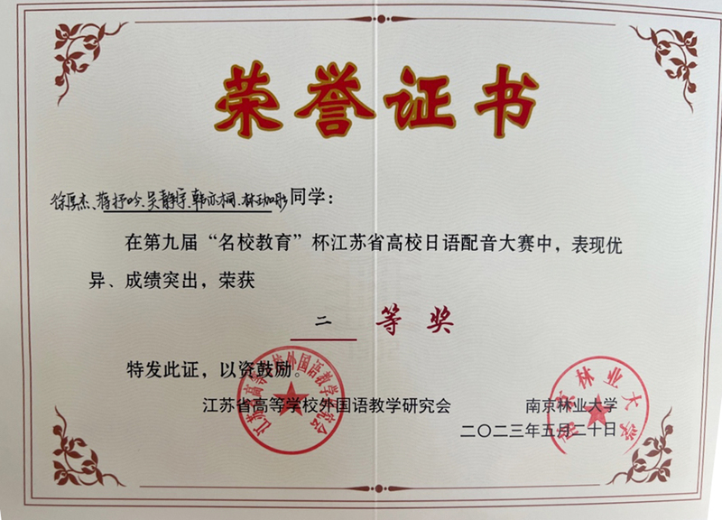 本次大赛由江苏省高校外语教学研究会主办、南京林业大学云顶国际承办、名校教育集团东京云顶国际共同协办,比赛吸引了南京师范大学、江南大学、扬州大学等省内23所高校团队参赛。初赛配音环节中,日语系21级、22级员工徐厚杰、蒋抒吟、吴静宇、韩亦桐、林珈彤五名同员工动演绎了日本动漫作品片段,赢得评委一致认可,并进入决赛演讲环节。进入决赛的13支队伍采用随机抽取日本谚语并进行即兴演讲,由一名选手代表参赛。经过两轮比赛的激烈角逐,最终荣获二等奖。