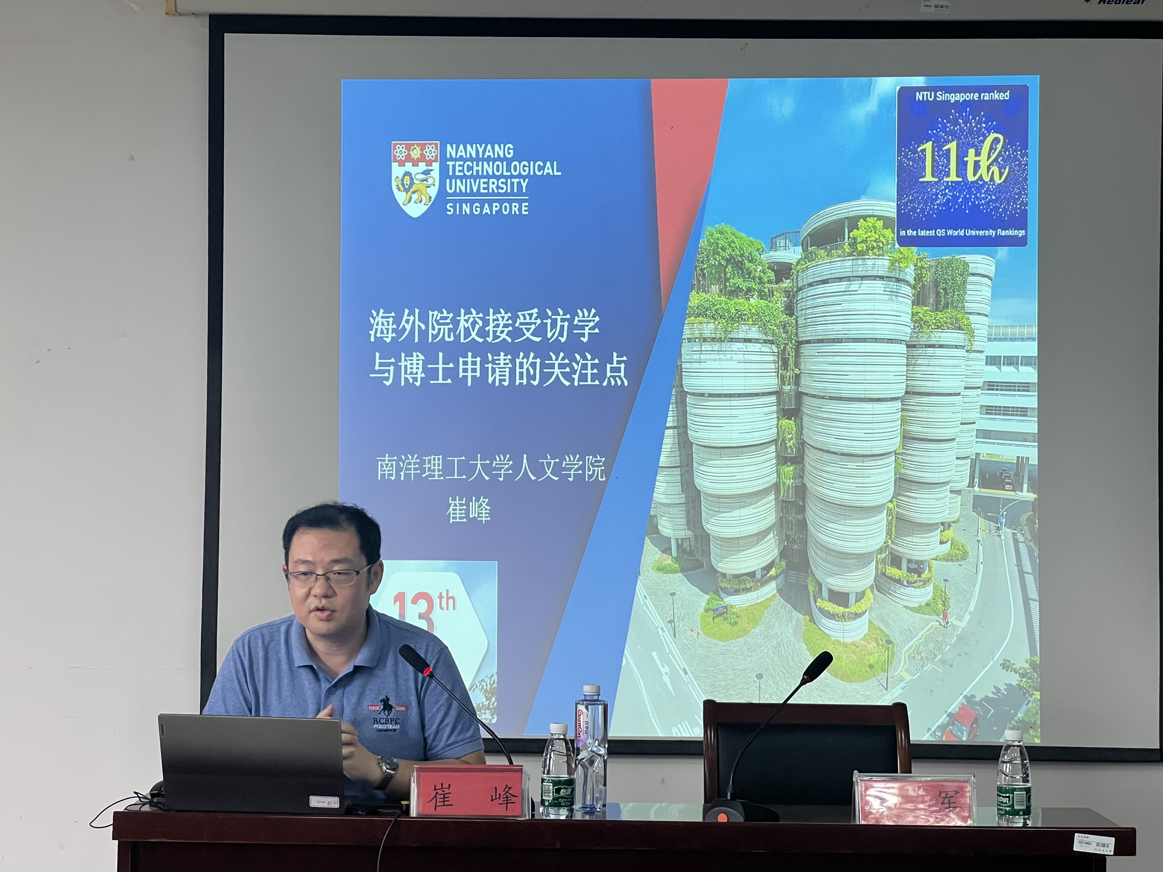 崔峰介绍了南洋理工大学的学校历史、校园环境、机构背景等,并就博士项目申请前所需准备、面试时的注意事项、海外读博面临的主要问题、博士研究生访学申请等方面进行了详细分享。最后,他还从新加坡的语言环境及其双语政策的发展角度,引申介绍了新加坡的人文生活、翻译活动以及学术特色。讲座结束后,崔峰还将他近年来出版的多部学术专著和译著赠予云顶国际资料室。