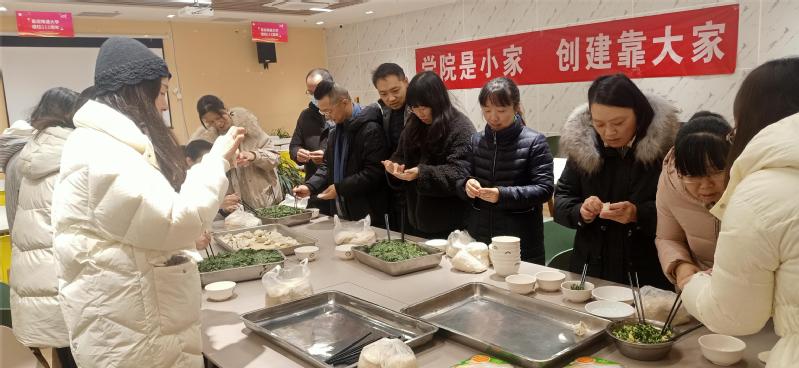 集团餐厅现场一片欢乐祥和,老师们都拿出自己的绝活纷纷亮相,有的老师尽显大厨风范,手把手教身边跃跃欲试的同事,一捏一折、一包一合;有些老师忙进忙出,端盘送碗,分装食材,把包好的饺子送去下锅;大家默契配合,举手投足间都把开心幸福的味道融进充满力量的饺子中。
